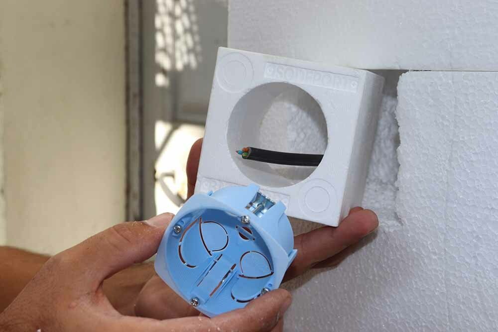 Bloc de montage en PSE expansé 150kg/m3. Ils viennent s'insérer directement dans l'épaisseur de l'isolant (Fibre de bois, polystyrène, laine de roche, etc....). Le bloc intègre le boitier d'encastrement destiné à recevoir une prise de courant, un interrupteur ou un autre accessoire électrique. Il est adapté à toute épaisseur d'isolant, garantit la rupture de pont thermique et facilite la mise en oeuvre d'accessoires électriques