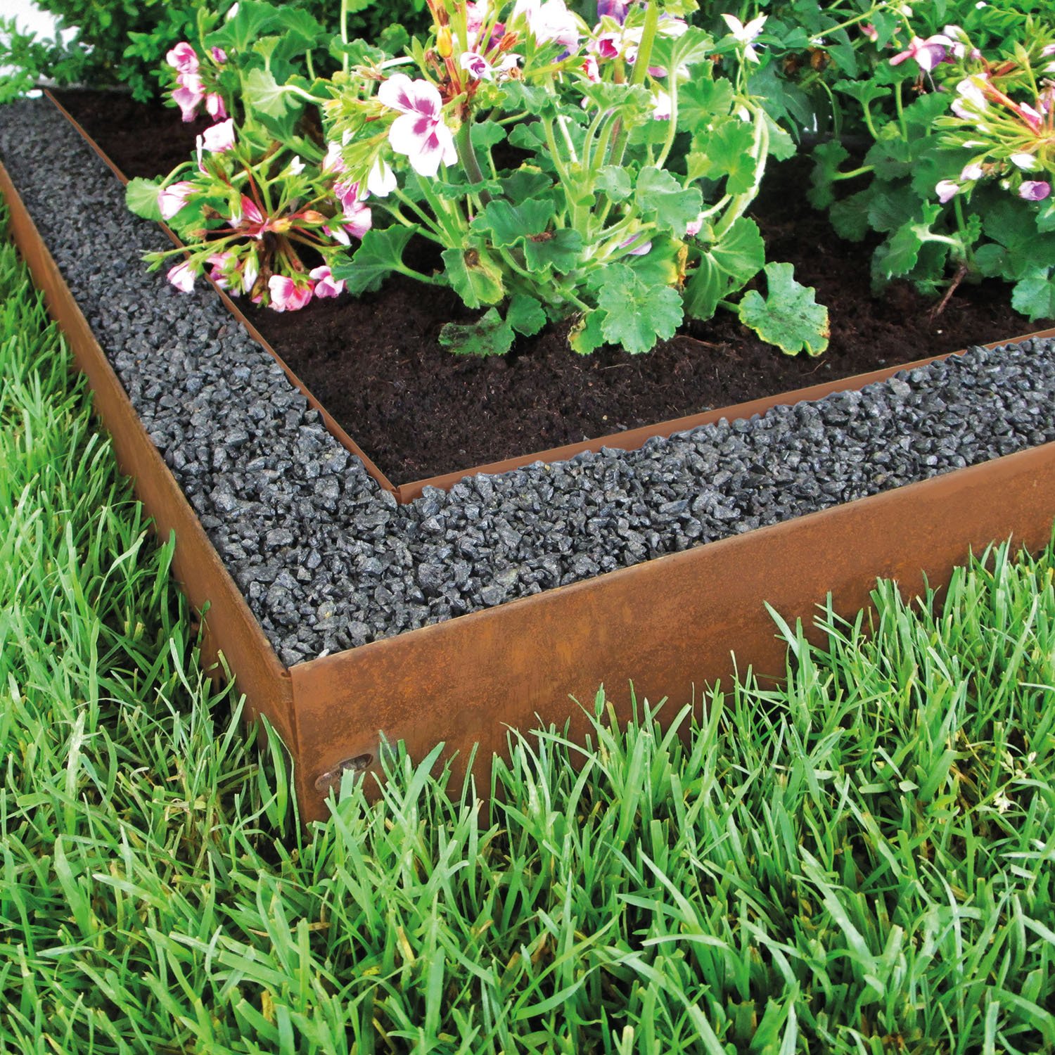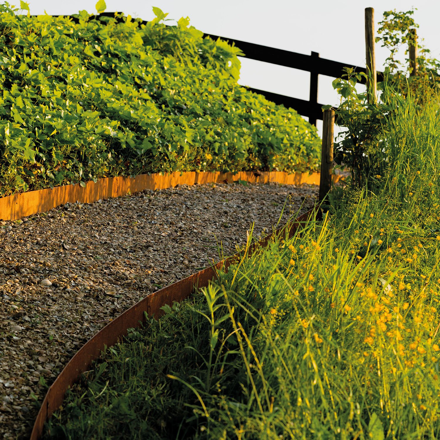 Les éléments individuels peuvent être placés les uns sur les autres et fixés ensemble en pliant la goupille perforée à l'aide d'un tournevis. L'installation se fait rapidement en piquant le sol avec un coupe-bordure. Les bordures de pelouse peuvent également être pliées à tout moment pour obtenir un bord stable. Les tôles en corten sont livrées nues et ne forment leur patine de rouille typique qu'avec le temps. Installée à la fin de l'automne, la couche de barrière avec sa merveilleuse couleur terreuse typique se forme tranquillement pendant l'hiver et donnera à votre jardin l'aspect parfait au printemps.
