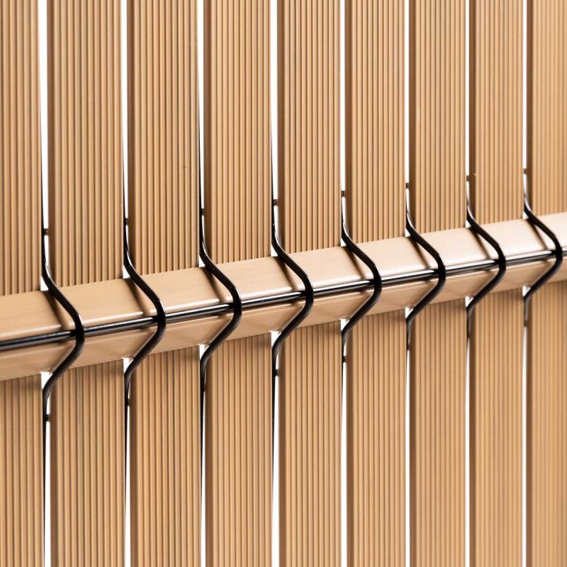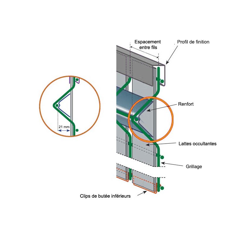 - 43 lames de 49 mm de large (compatible avec les grillage dont les mailles font 50 mm (espace entre 2 fils), entraxe de 55mm environ)