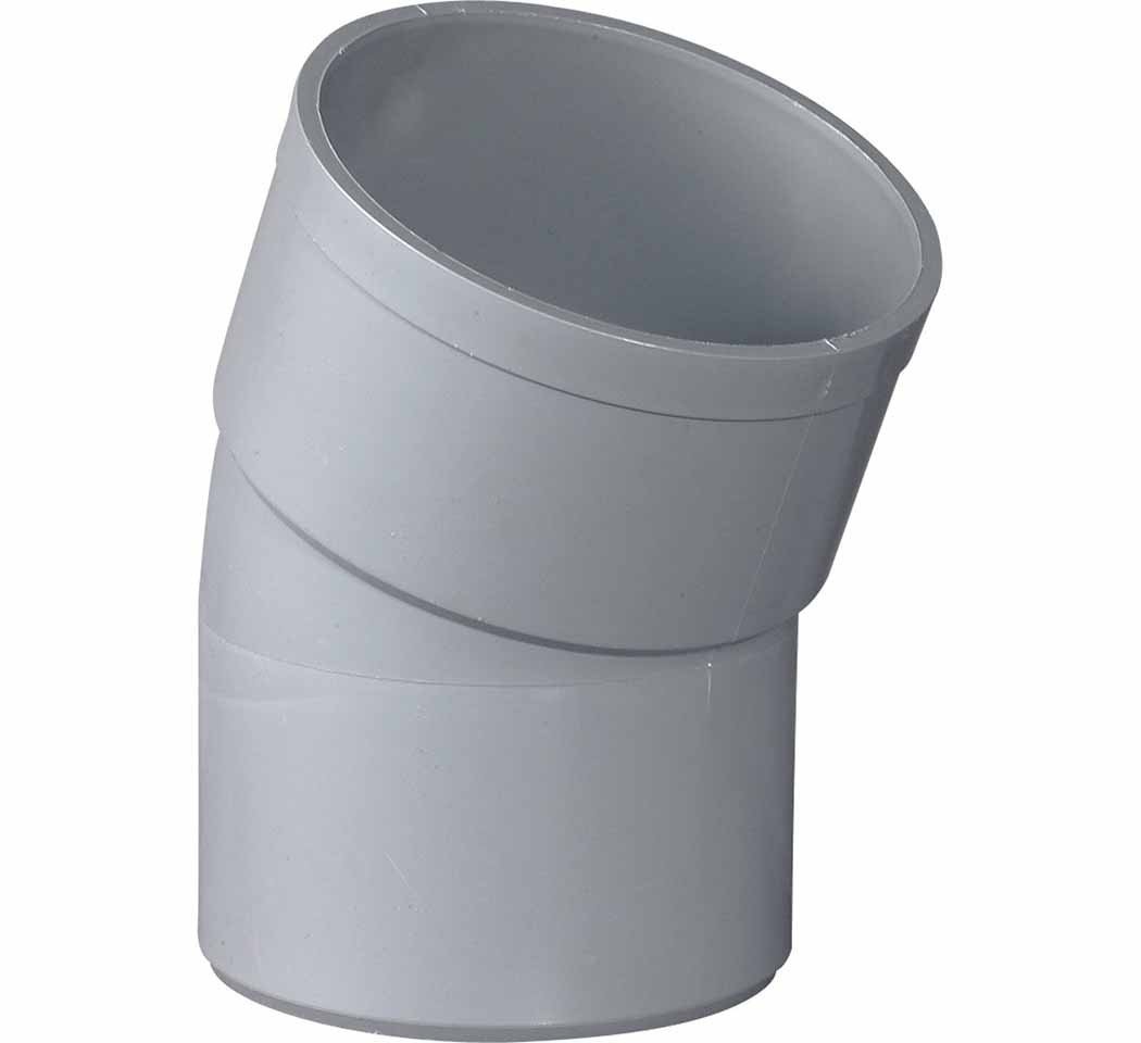 Coude PVC gris servant à la réalisation  de réseaux d'évacuation des eaux usées. Le scellement se fait par collage à l'aide de colle PVC.