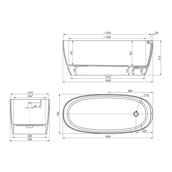 Baignoire ilôt CUBA en marbre reconstitué brillant, 1600 mm x 615 mm x 700 mm, avec trop plein, livré avec bonde