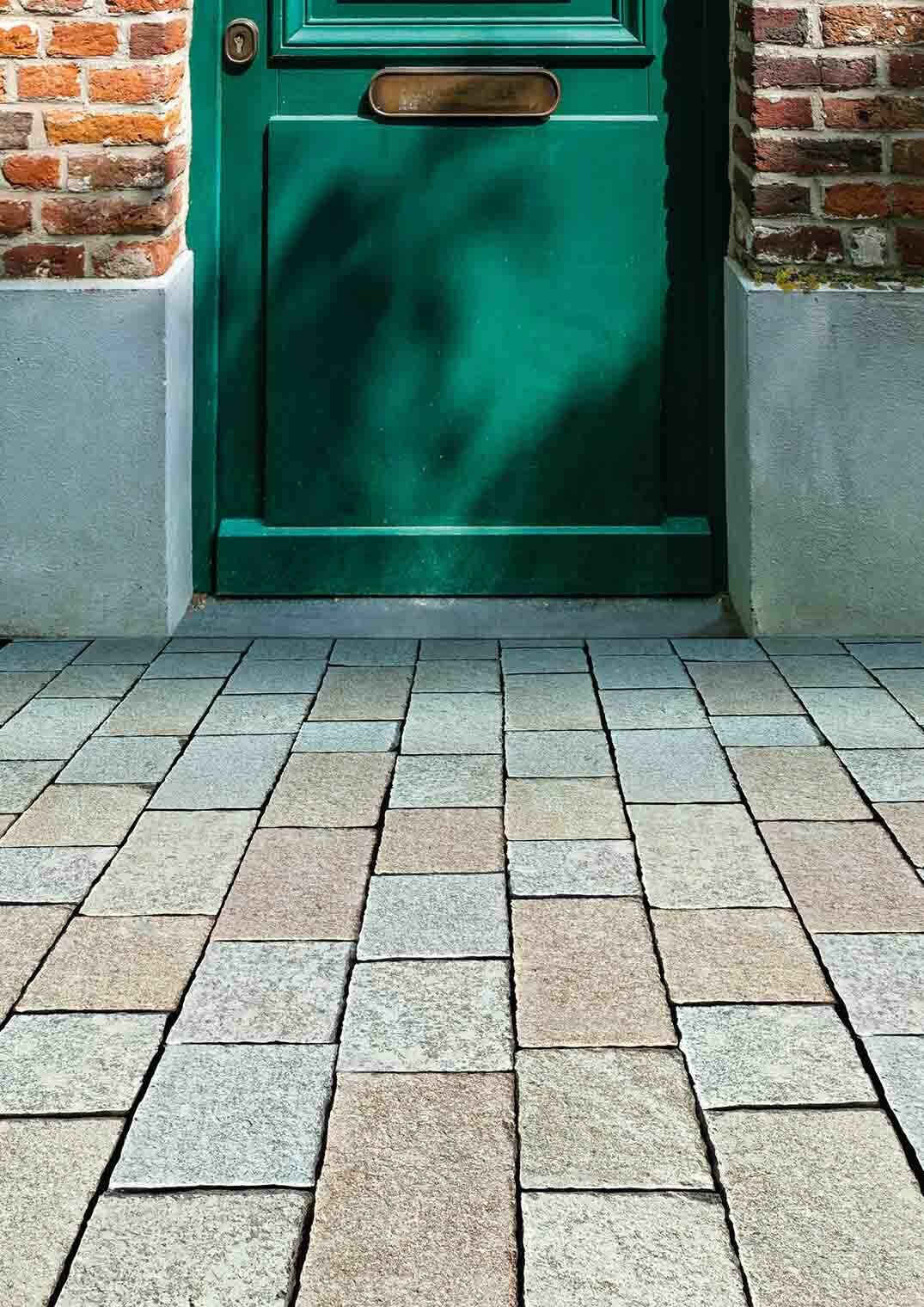 Pavé en pierre de Chine, bords clivés, aspect sablé, 10 cm x 10 cm x 5 cm