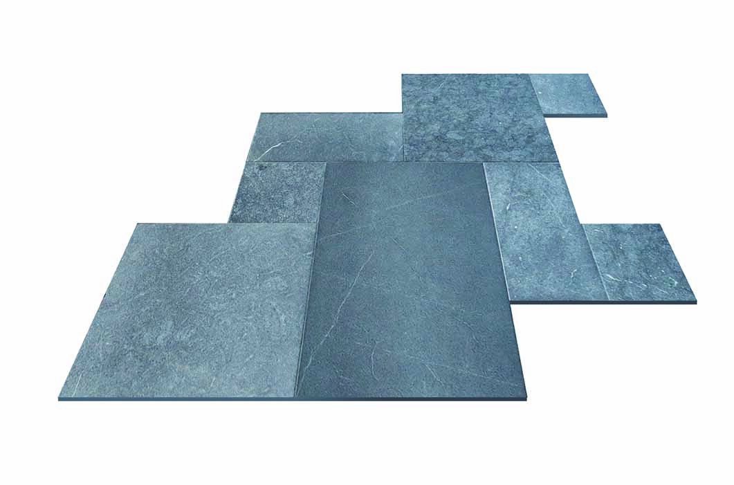 Dalle en marbre gris pour intérieur et extérieur, bords sciés, aspect sablé . Opus 4 formats épaisseur 1,2 cm