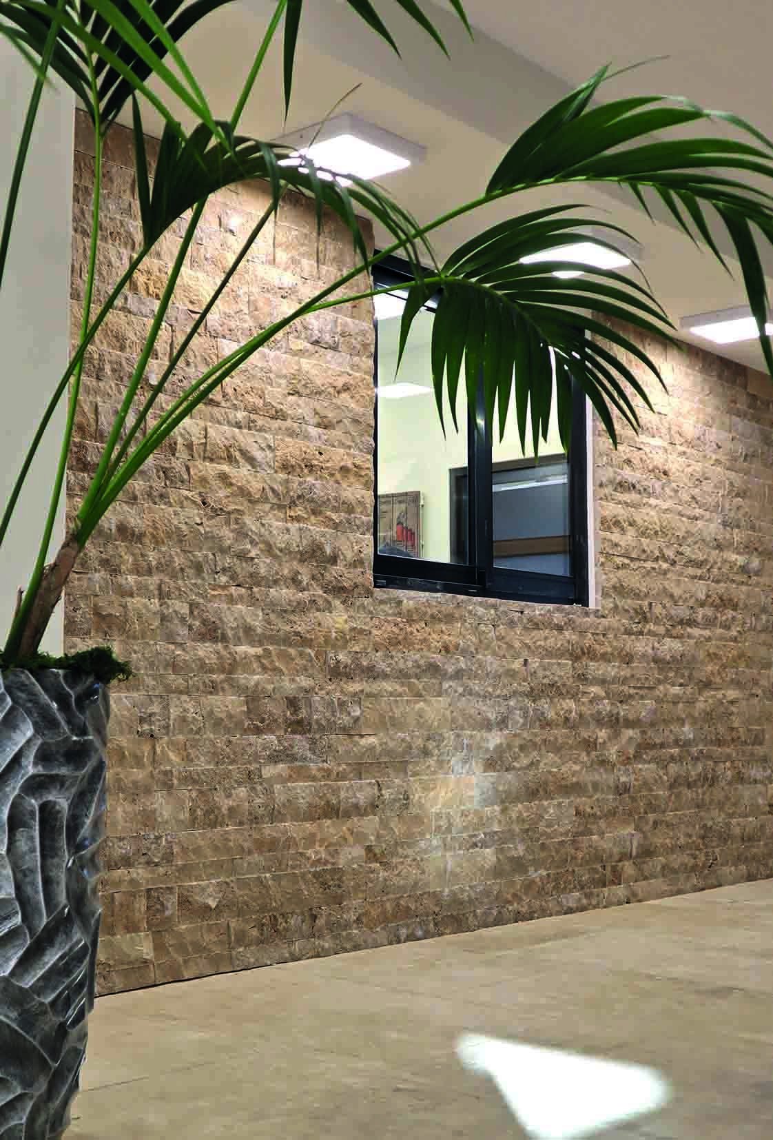 - Positionnez votre première plaquette à l’angle du mur en l’appuyant sur le tasseau