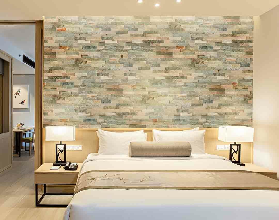 - Positionnez votre première plaquette à l’angle du mur en l’appuyant sur le tasseau