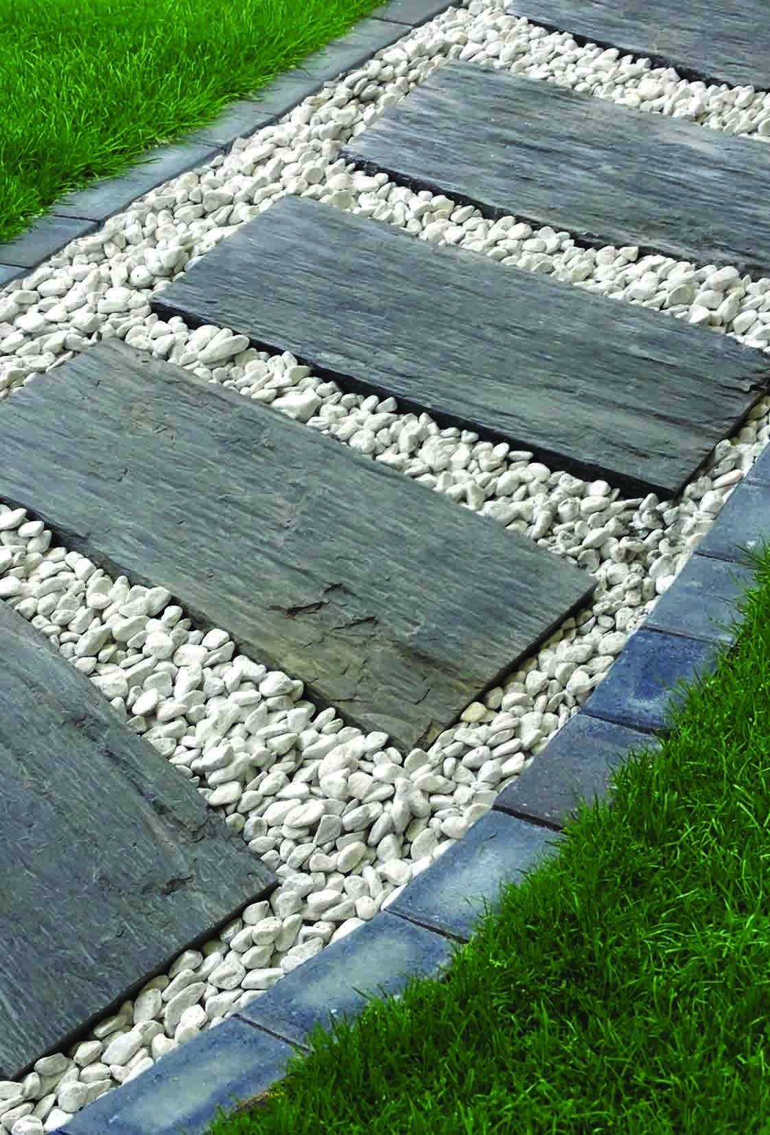 Dalles (ou palis) de schiste avec bords sciés, pouvant servir de brise-vue vertical ou alors de pas japonais pour matérialiser les espaces de circulation dans votre jardin.