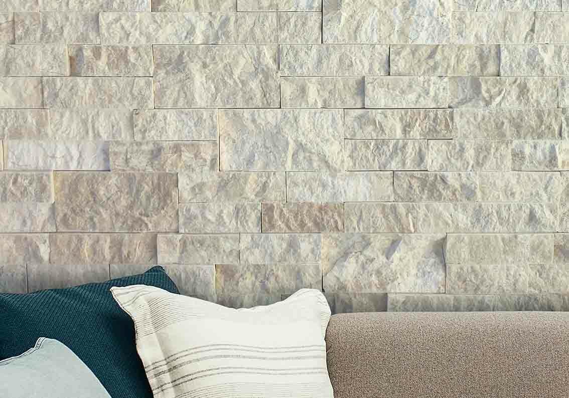 - Positionnez votre première plaquette à l’angle du mur en l’appuyant sur le tasseau