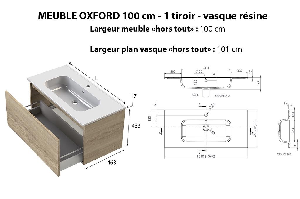 Corps de meuble et façades en panneau aggloméré haute densité de 18 mm d'épaisseur hydrofugés, fabrication française, livré pré-monté, découpe du 1er tiroir pour emplacement du siphon