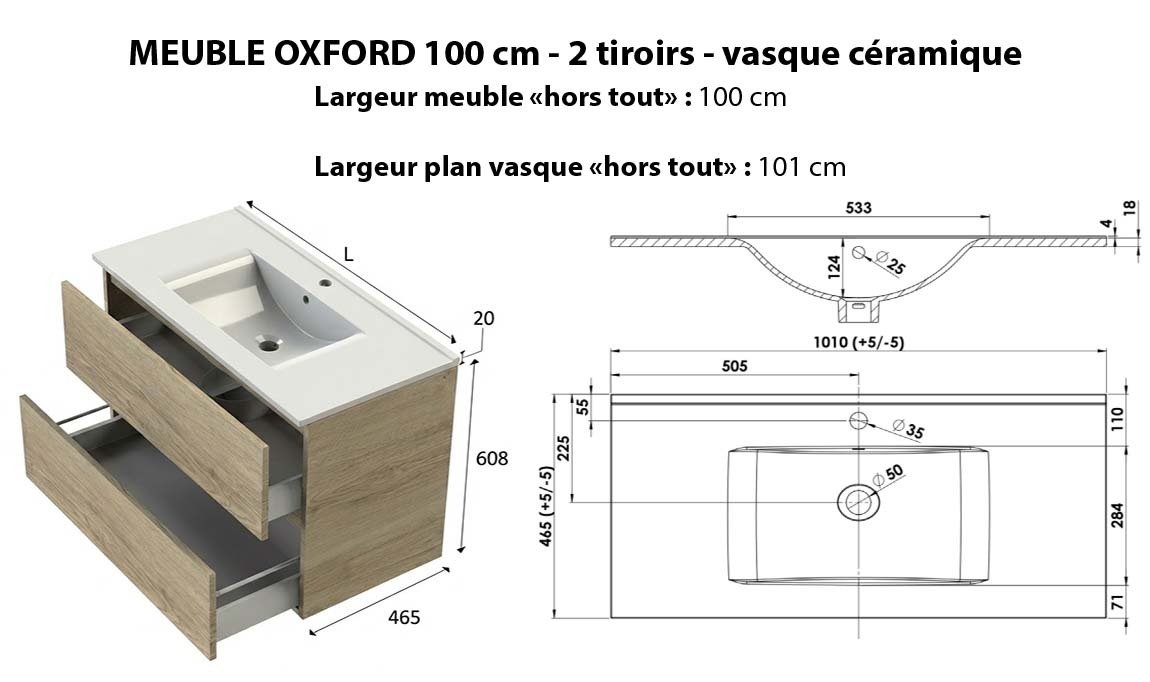 Corps de meuble et façades en panneau aggloméré haute densité de 18 mm d'épaisseur hydrofugés, fabrication française, livré pré-monté, découpe du 1er tiroir pour emplacement du siphon