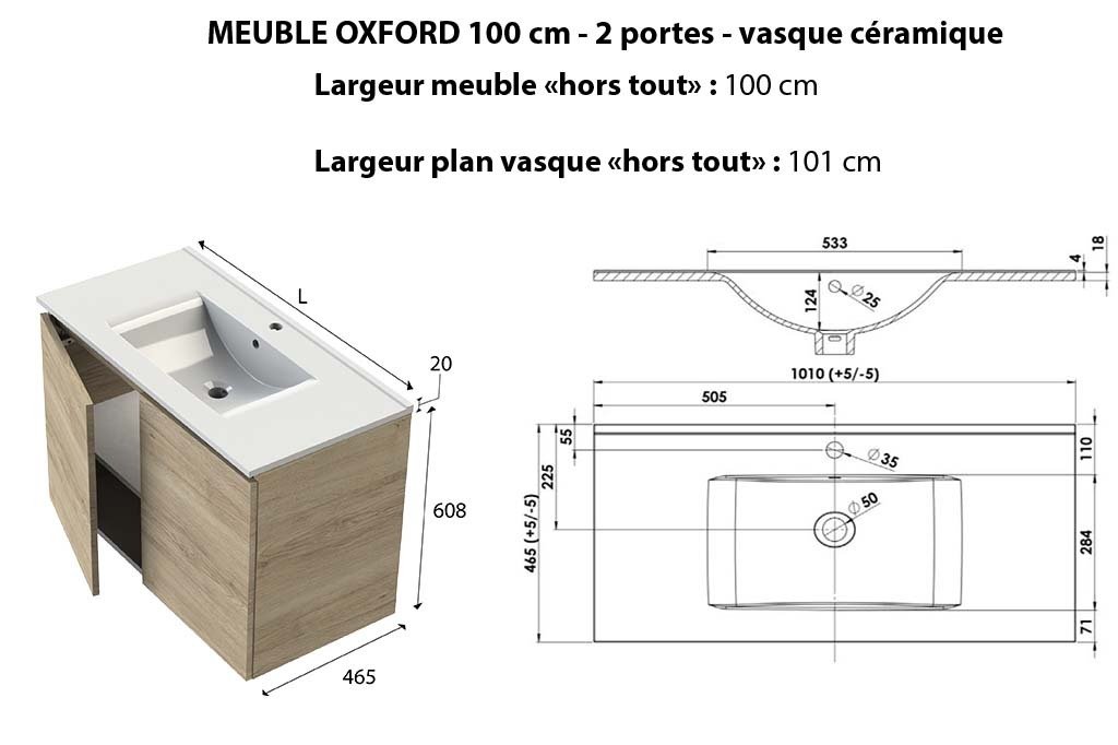 Ensemble meuble de salle de bain Oxford 100 cm chêne Sanremo, plan vasque céramique, 2 portes +colonne P. 17 cm x H. 104 cm , miroir LED