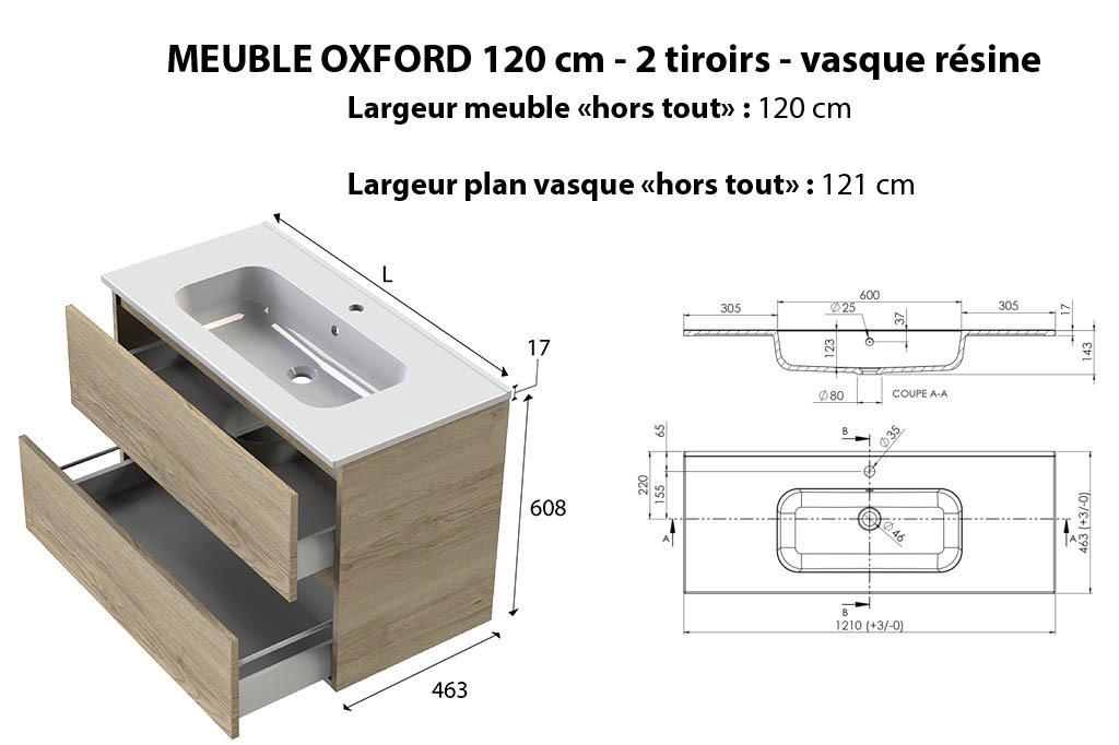 Corps de meuble et façades en panneau aggloméré haute densité de 18 mm d'épaisseur hydrofugés, fabrication française, livré pré-monté, découpe du 1er tiroir pour emplacement du siphon