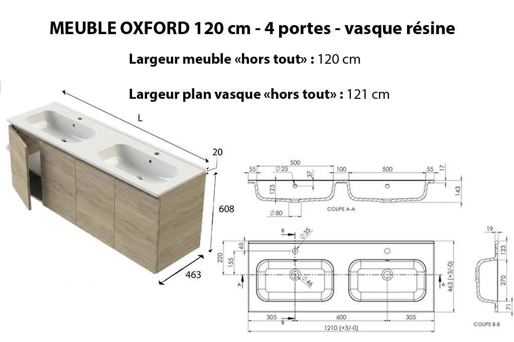 -Meubles livrés montés, assemblage tourillonné/collé, suspendu par boitiers d'accrochage anti-décrochement réglable, et avec vide sanitaire.