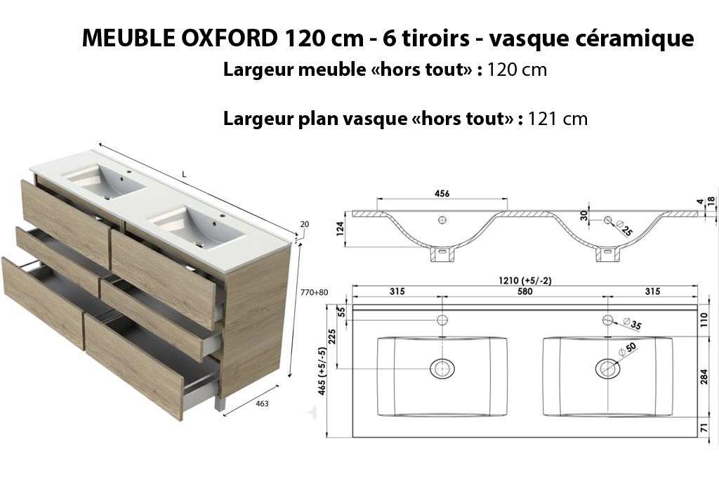 • Ensemble meuble de salle de bain Oxford 120 cm chêne Sanremo, plan double vasque céramique, 6 tiroirs