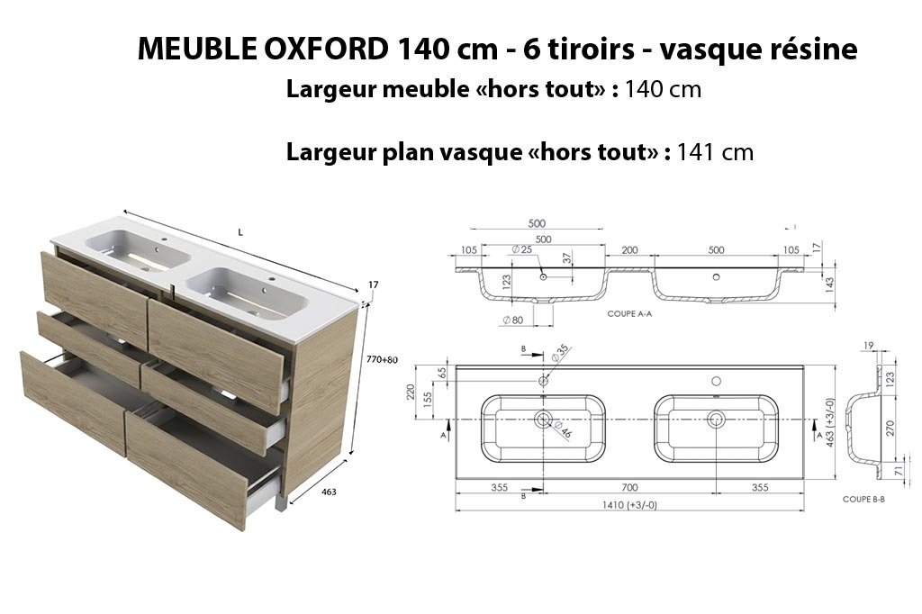 • Ensemble meuble de salle de bain Oxford 140 cm basalte brillant, plan double double vasque marbre reconstitué, caisson double, 6 tiroirs
