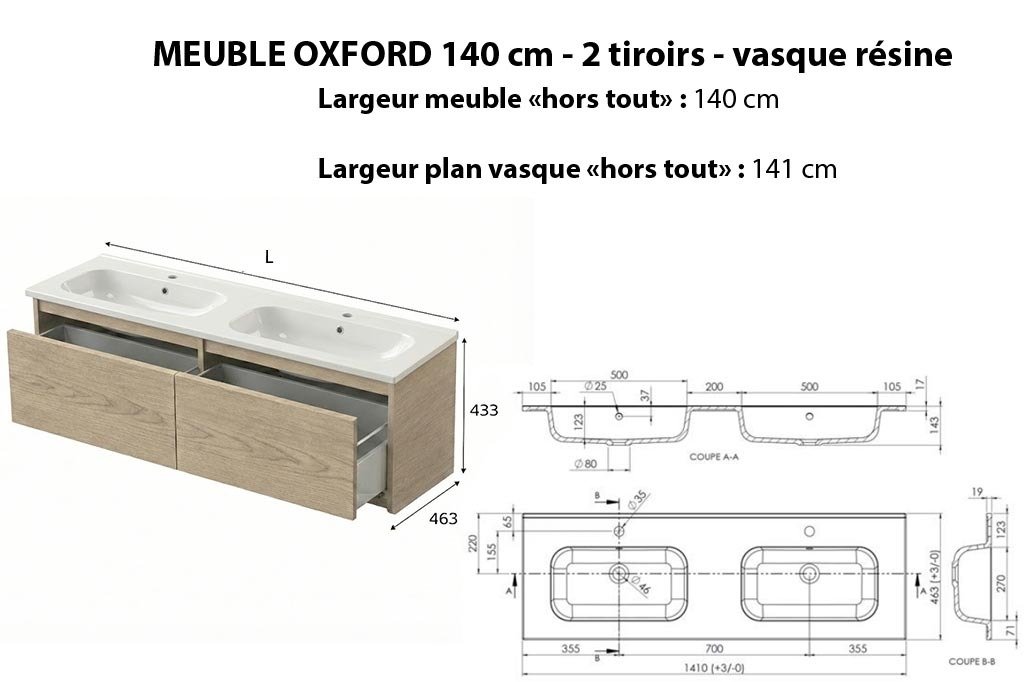 Ensemble meuble de salle de bain Oxford 140 cm chêne Sanremo, plan double double vasque marbre reconstitué, 2 tiroirs