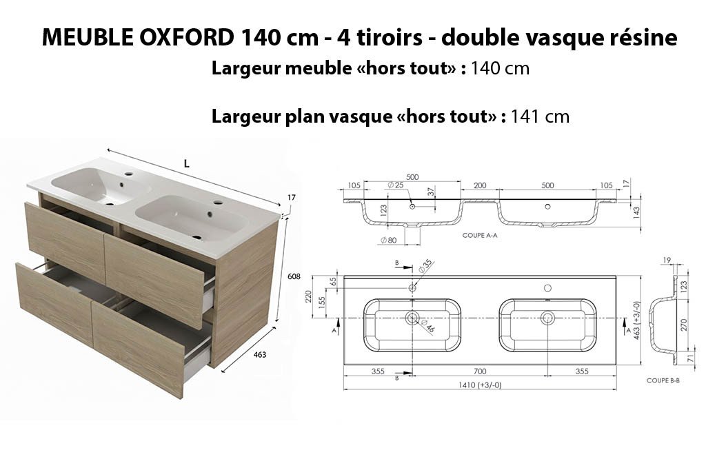 Ensemble meuble de salle de bain Oxford 140 cm chêne Sanremo, plan double double vasque marbre reconstitué, 4 tiroirs