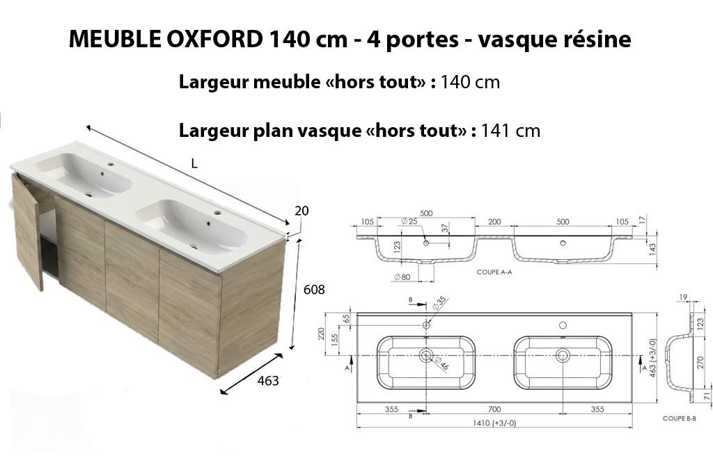 • Ensemble meuble de salle de bain Oxford 140 cm chêne Sanremo, plan vasque marbre reconstitué, 4 portes