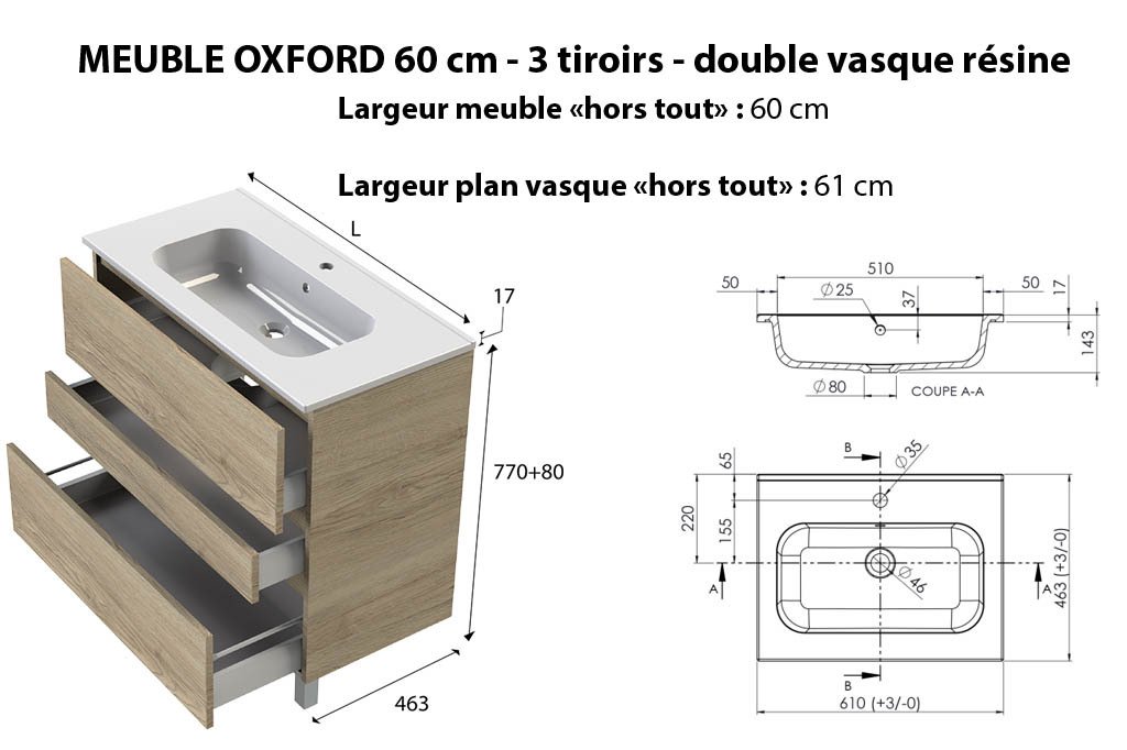 Corps de meuble et façades en panneau aggloméré haute densité de 18 mm d'épaisseur hydrofugés, fabrication française, livré pré-monté, découpe du 1er tiroir pour emplacement du siphon
