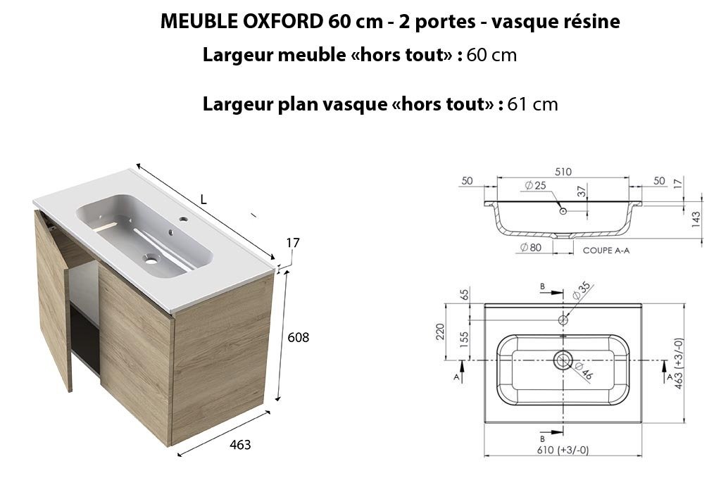 Corps de meuble et façades en panneau aggloméré haute densité de 18 mm d'épaisseur hydrofugés, fabrication française, livré pré-monté, découpe du 1er tiroir pour emplacement du siphon