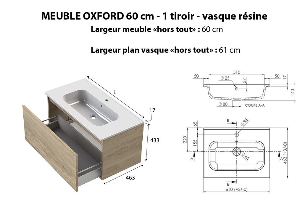 Corps de meuble et façades en panneau aggloméré haute densité de 18 mm d'épaisseur hydrofugés, fabrication française, livré pré-monté, découpe du 1er tiroir pour emplacement du siphon