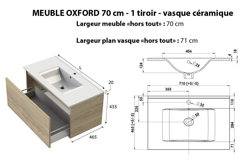• Ensemble meuble de salle de bain Oxford 70 cm blanc brillant, plan vasque céramique, 1 tiroir