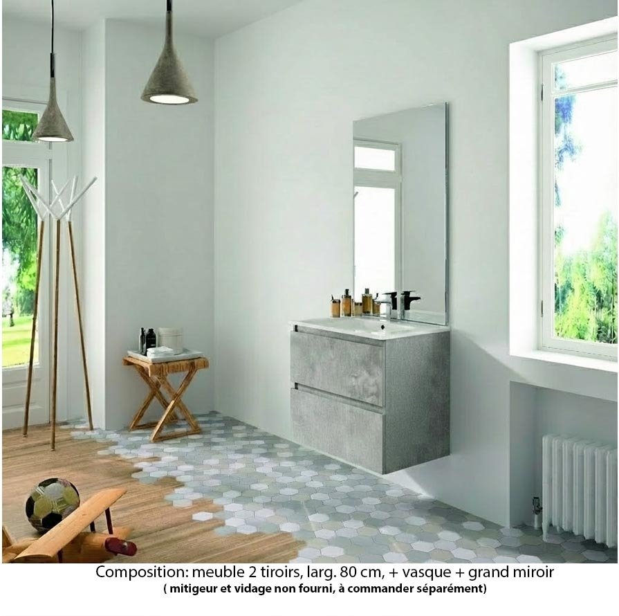Ensemble meuble de salle de bain Oxford 80 cm béton Bellato, plan vasque céramique, 2 tiroirs , miroir haut. 110 cm