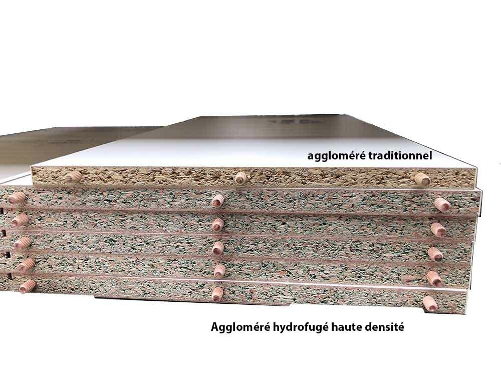 -Corps du meuble ET façades en panneau aggloméré de 18 mm, haute densité et hydrofugé (les meubles bas de gamme sont réalisés en aggloméré 15 mm basse densité, non hydrofugé)