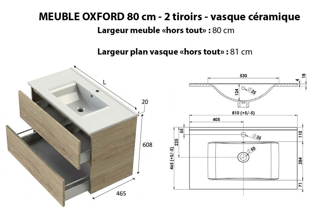 Corps de meuble et façades en panneau aggloméré haute densité de 18 mm d'épaisseur hydrofugés, fabrication française, livré pré-monté, découpe du 1er tiroir pour emplacement du siphon