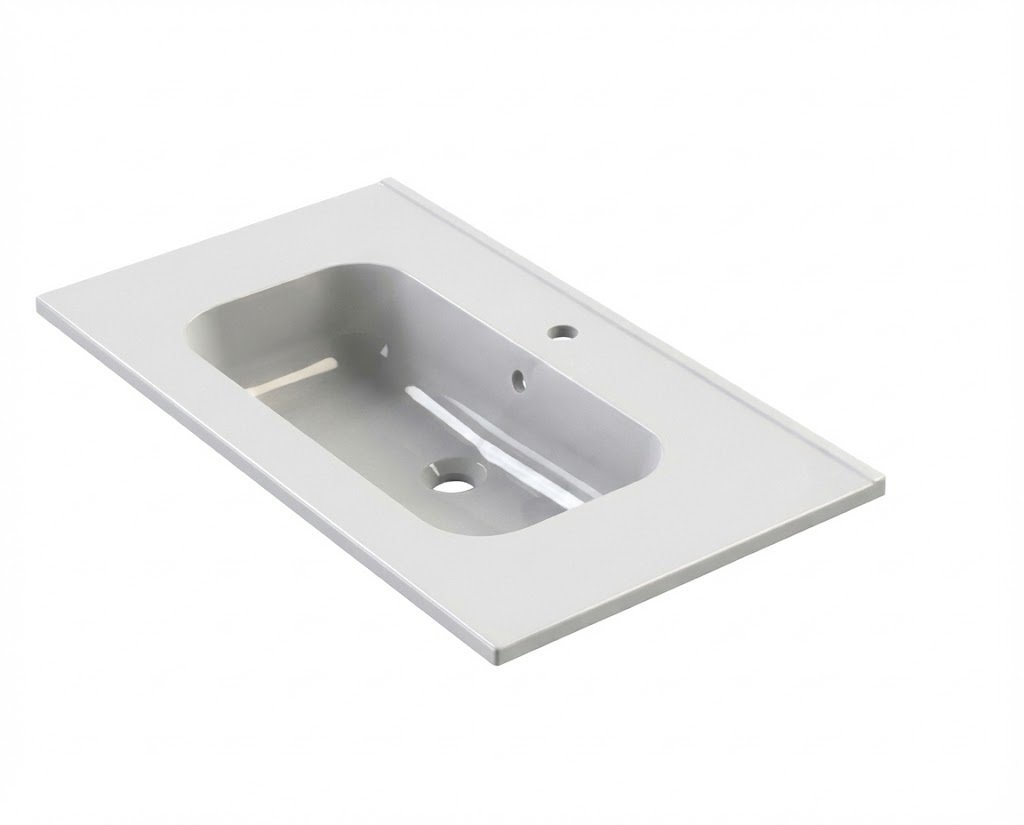 - Vasques en céramique blanc brillant ou marbre reconstitué (au choix), composé de polyester et de carbonate de calcium avec un revêtement en surface Gel Coat de type ISO.  (pas de vasque acrylique bas de gamme)