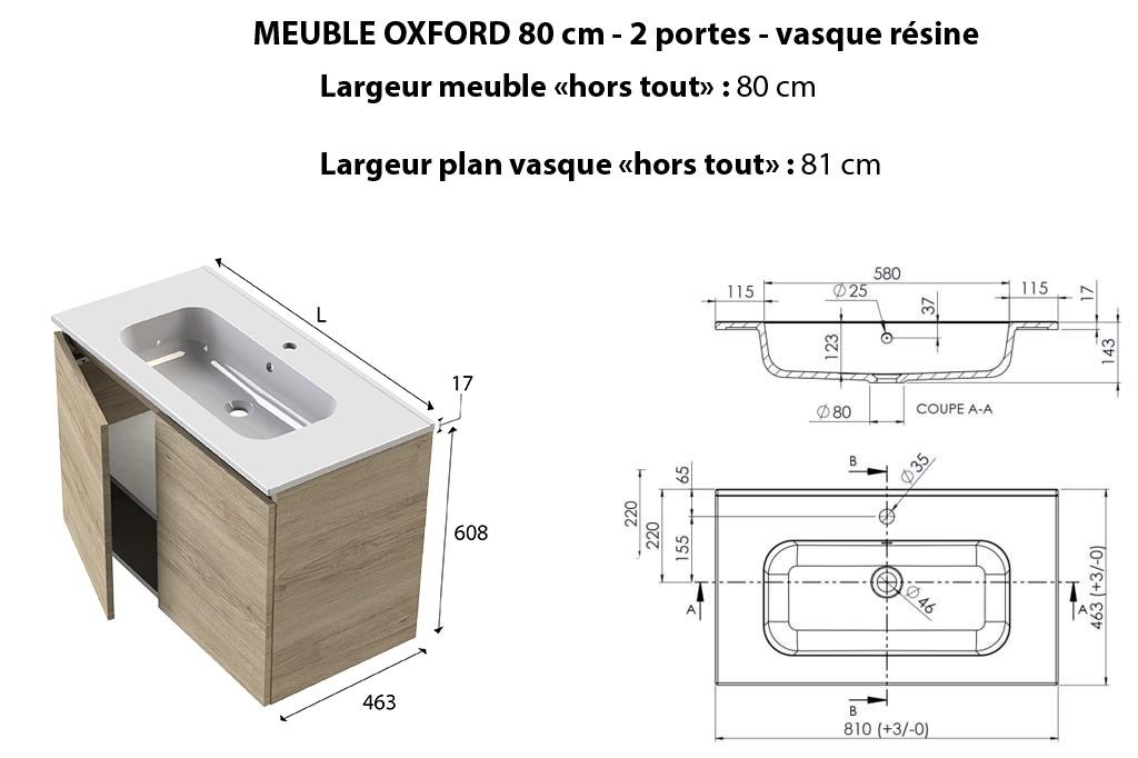 -Meubles livrés montés, assemblage tourillonné/collé, suspendu par boitiers d'accrochage anti-décrochement réglable, et avec vide sanitaire.