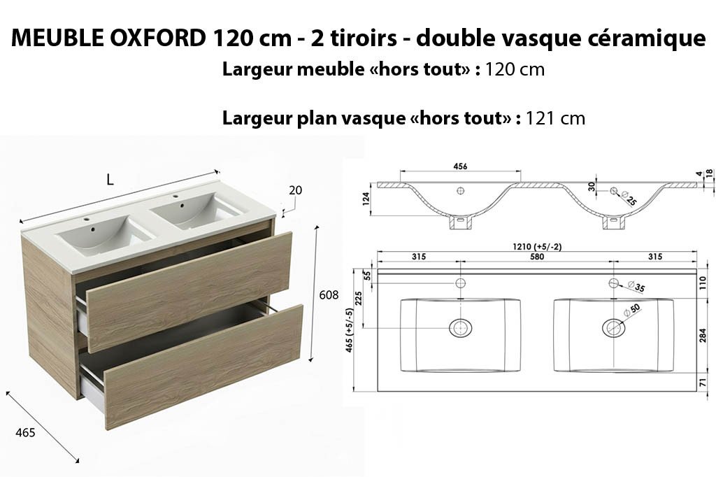 Ensemble meuble de salle de bain Oxford 80 cm chêne sanremo, plan vasque céramique, 2 tiroirs , miroir simple , colonne P. 35 cm x H. 153 cm