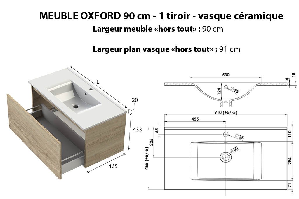 Les meubles 1 tiroir nécessitent impérativement l'utilisation d'un siphon déporté.​​