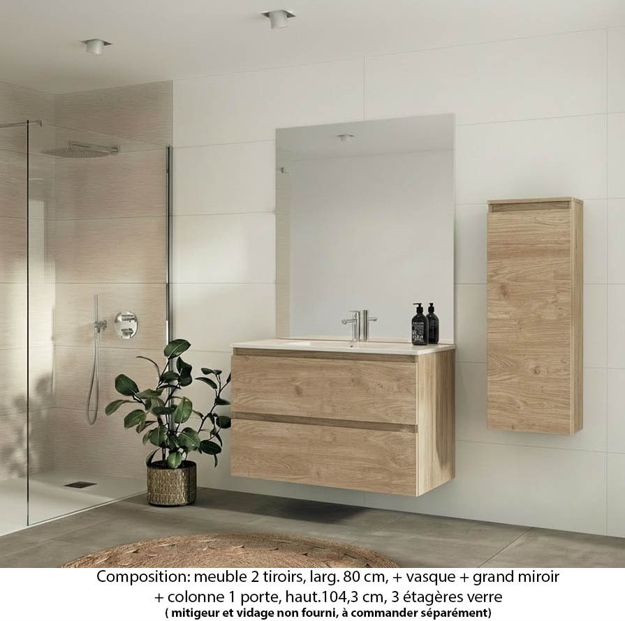 Ensemble meuble de salle de bain Oxford 90 cm chêne sanremo, plan vasque marbre reconstitué, 2 tiroirs , miroir plan , colonne P.17 cm x H. 104 cm
