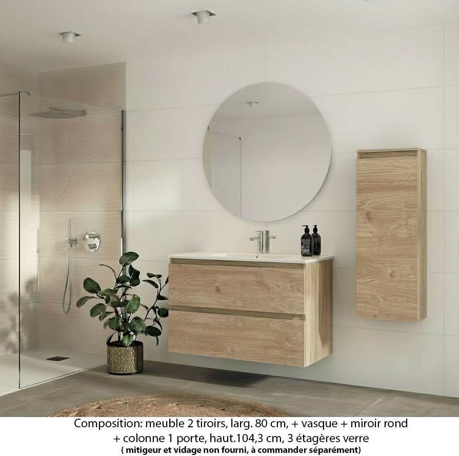 Ensemble meuble de salle de bain Oxford 90 cm chêne sanremo, plan vasque marbre reconstitué, 2 tiroirs , miroir rond , colonne P.17 cm x H. 104 cm
