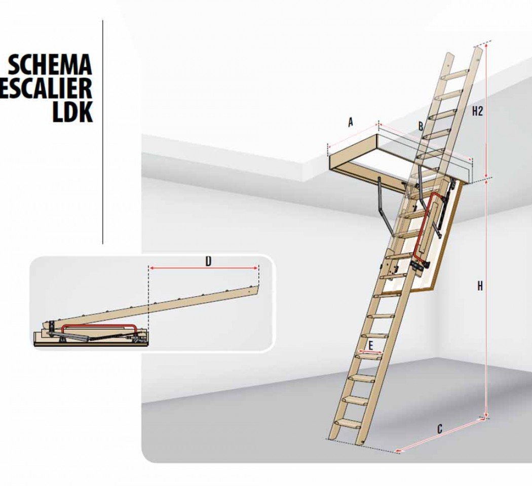 L’escalier escamotable LDK est équipé d’une échelle en bois en 2 parties (dont l’élément inférieur est coulissant) et d’une trappe isolée.