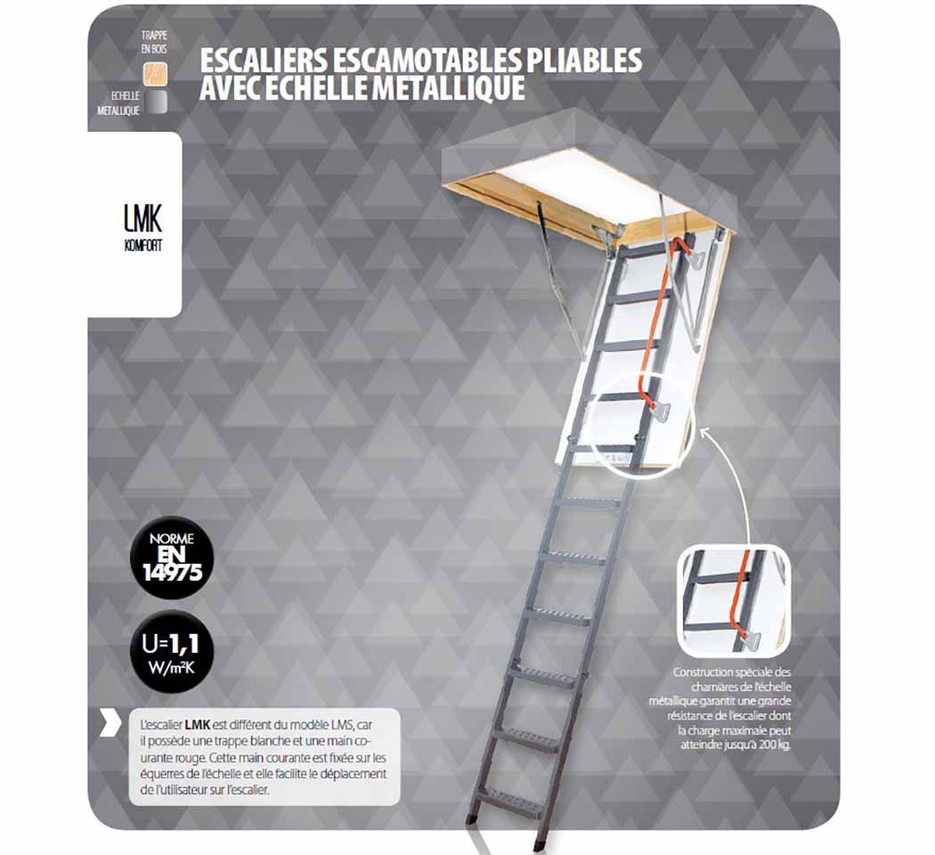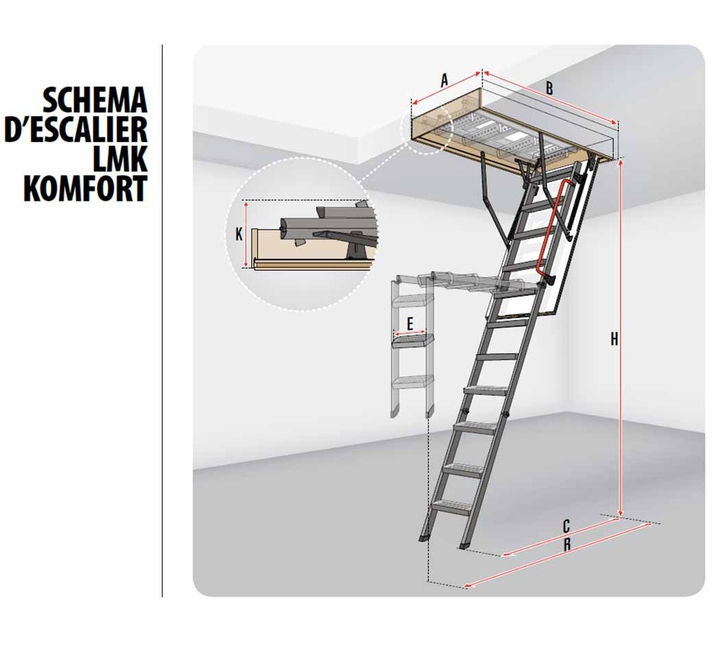 L’escalier LMK Komfort est différent du modèle LMS, car il possède une trappe blanche et une main courante rouge.