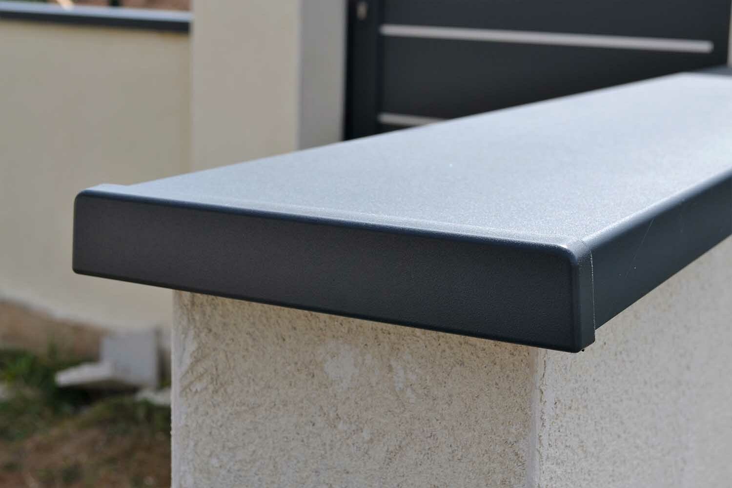 Contrairement à un chapeau de mur en béton traditionnel, les couvre-mur aluminium peuvent se poser par tous les temps, car il n’y a pas de contraintes de températures et il n’y pas de besoin d’encollage.