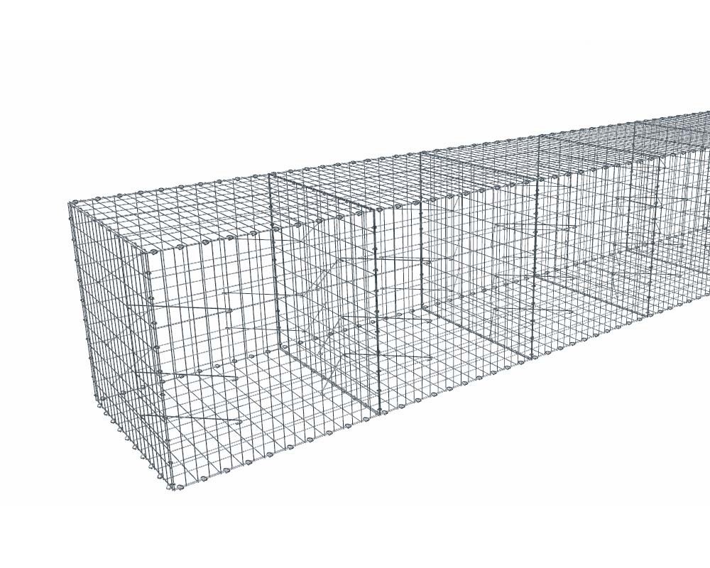Il n'y a pas de doublement de cloisons. Seulement une cloison interne tous les mètres. Recoupe aisée avec une disqueuse ou une pince coupe-boulon. Ces gabions peuvent être superposés. Dans le cas de plusieurs rangs superposés, le couvercle du 1er rang servira de fond pour le 2eme rang, etc...