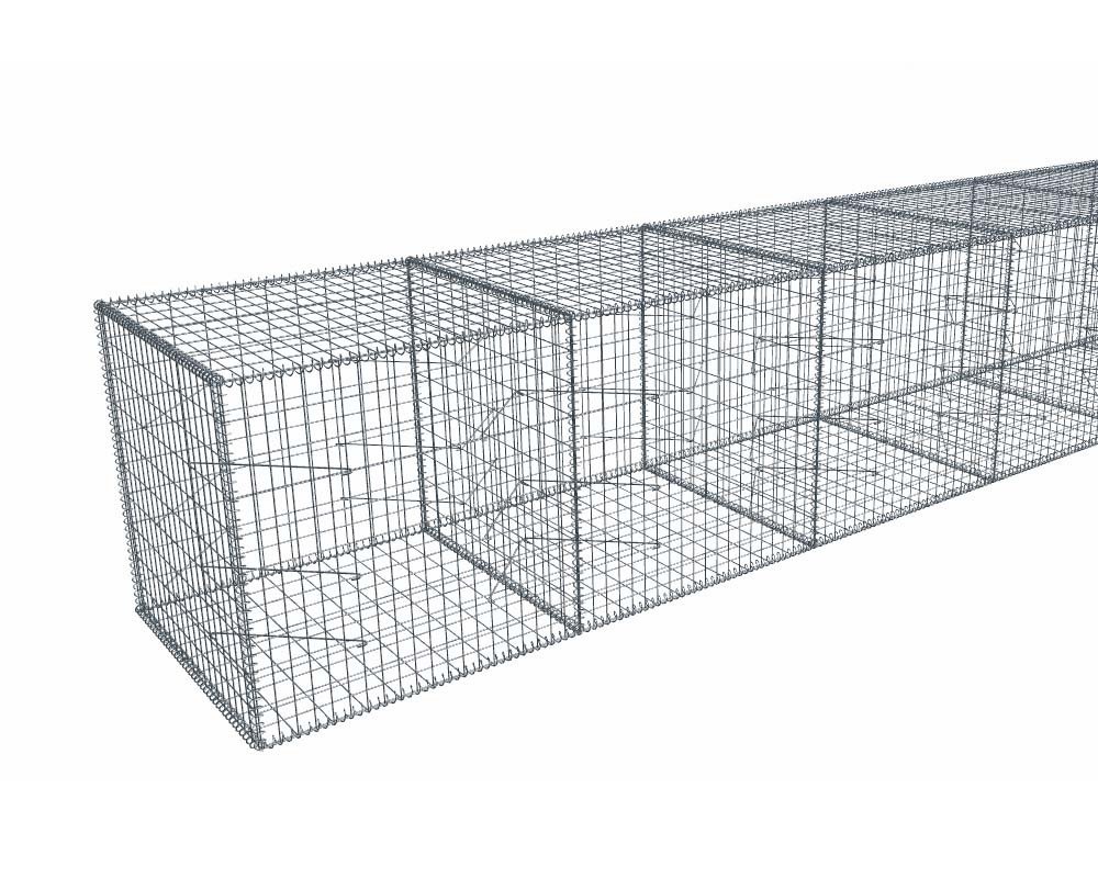 Il n'y a pas de doublement de cloisons. Seulement une cloison interne tous les mètres. Recoupe aisée avec une disqueuse ou une pince coupe-boulon. Ces gabions peuvent être superposés. Dans le cas de plusieurs rangs superposés, le couvercle du 1er rang servira de fond pour le 2eme rang, etc...