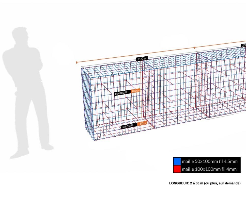 Ces gabions sont des modules de 2 ml, composés de panneaux de 2 m de long. Pour les kits de moins de 6 m de longueur, les côtés sont composés de panneaux de 1 m de longueur.