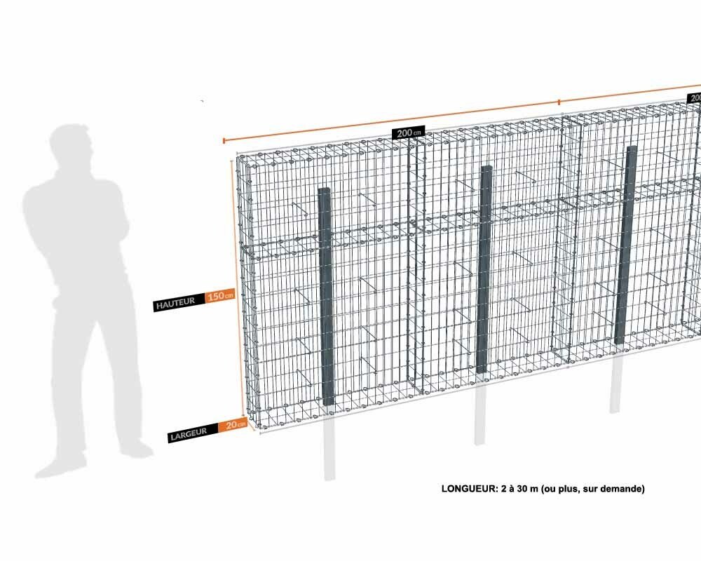 Pour les gabions clôture de 20 cm de largeur et d'une hauteur égale ou supérieure à 1 m, ainsi que pour tous les gabions clôture de largeur 30 cm et d'une hauteur égale ou supérieure à 1.20 m, il est impératif de mettre en place des poteaux raidisseurs ( à sceller ou à visser). Cela évitera tout risque de basculement accidentel. Si vous disposez déjà de poteaux raidisseurs, vous pouvez commander les kits sans poteaux.