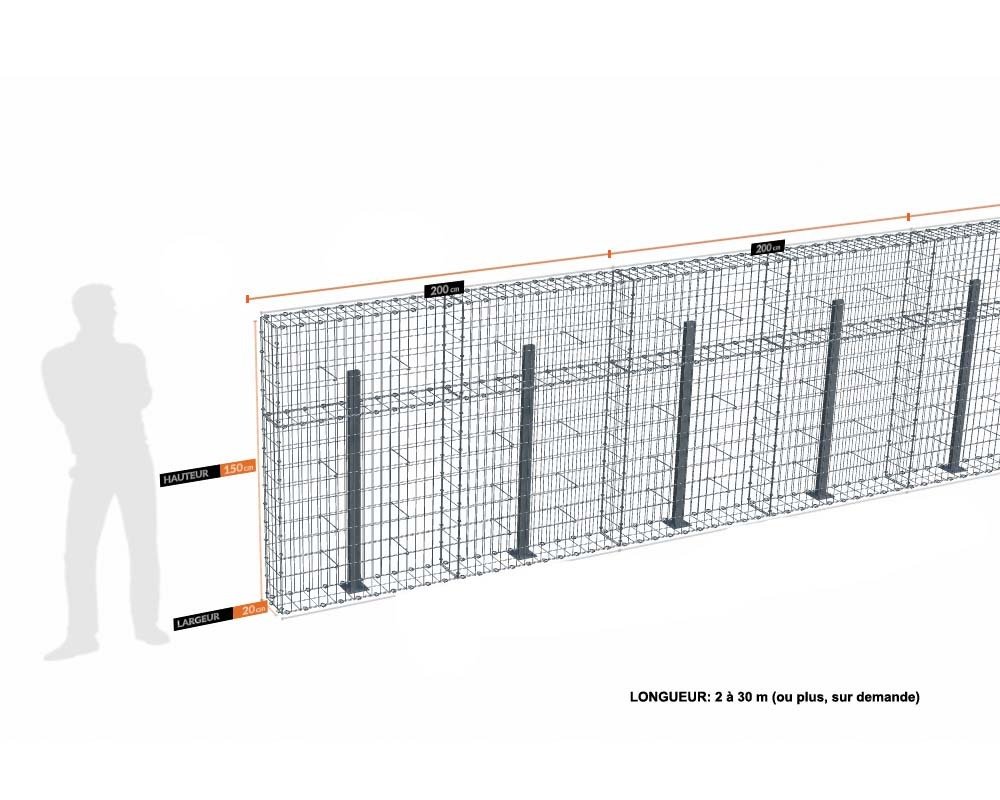 Kit gabion 150cm (H) x 20cm (L), pour clôture, assemblage agrafes, mailles 5 x 10 cm, avec poteaux raidisseurs à visser. Kit de 14 m de longueur. Ces gabions sont livrés complets, sans les pierres, et à assembler. Mailles de 5 cm x 10 cm en fils de 4,5 mm sur les faces visibles. Mailles de 10 cm x 10 cm en fils de 4 mm sur les faces invisibles.
