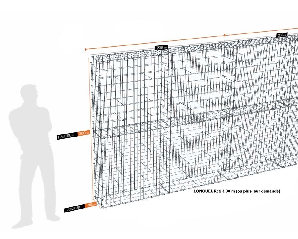 Kit gabion 200cm (H) x 30cm (L), pour clôture, assemblage agrafes, mailles 5 x 10 cm en fils de 4,5 mm sur les faces visibles. Mailles 10 x 10 cm en fils de 4 mm sur les faces invisibles .Kit de 14 m de longueur. Ces gabions sont livrés complets, sans les pierres, et à assembler.