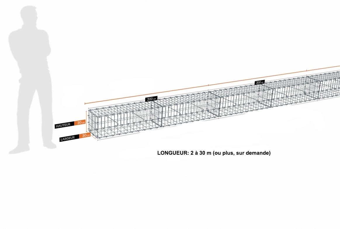 Kit gabion 30cm (H) x 30cm (L), pour clôture, assemblage agrafes, mailles 5 x 10 cm en fils de 4,5 mm sur les faces visibles. Mailles 10 x 10 cm en fils de 4 mm sur les faces invisibles .Kit de 14 m de longueur. Ces gabions sont livrés complets, sans les pierres, et à assembler.