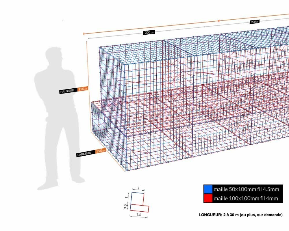 Ces gabions sont des modules de 2 ml, composés de panneaux de 2 m de long. Pour les kits de moins de 6 m de longueur, les côtés sont composés de panneaux de 1 m de longueur.