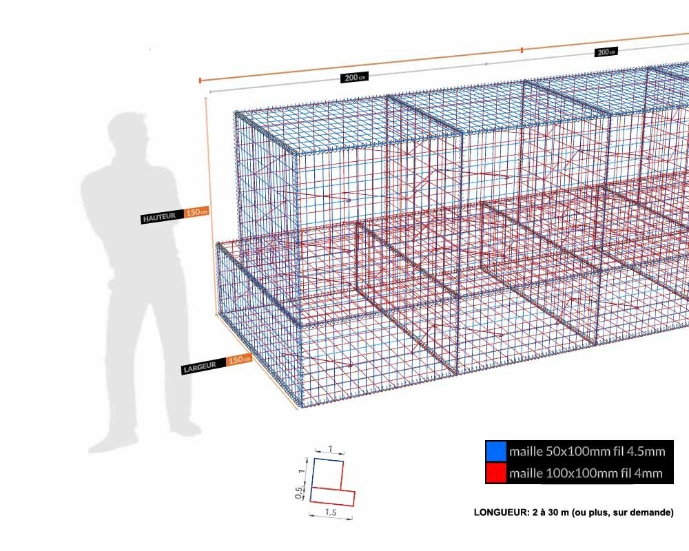 Ces gabions sont des modules de 2 ml, composés de panneaux de 2 m de long. Pour les kits de moins de 6 m de longueur, les côtés sont composés de panneaux de 1 m de longueur.