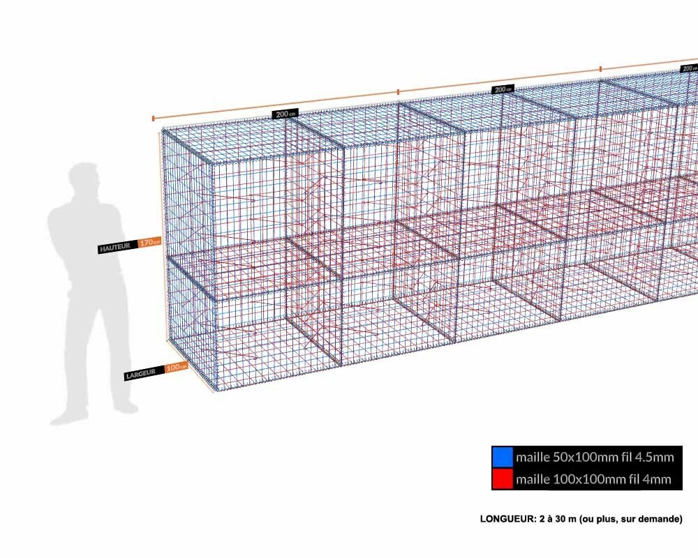 Ces gabions sont des modules de 2 ml, composés de panneaux de 2 m de long. Pour les kits de moins de 6 m de longueur, les côtés sont composés de panneaux de 1 m de longueur.