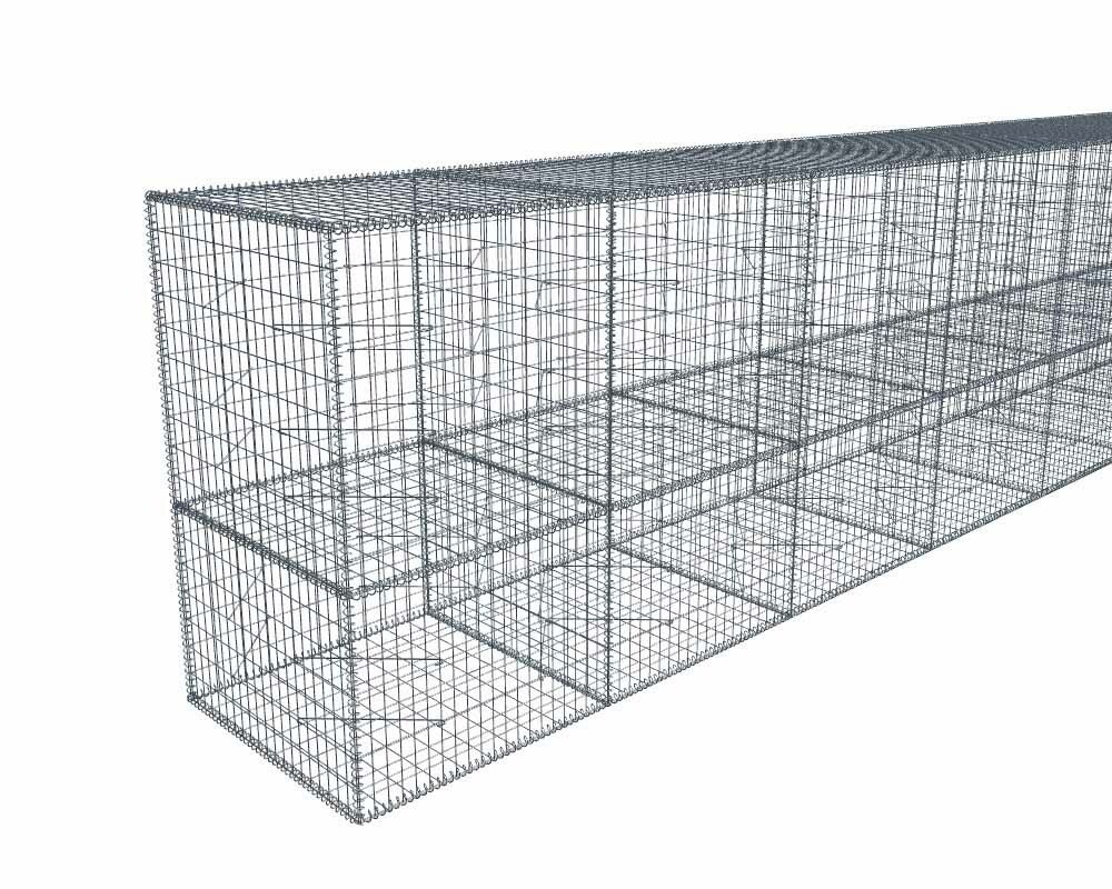 Il n'y a pas de doublement de cloisons. Seulement une cloison interne tous les mètres. Recoupe aisée avec une disqueuse ou une pince coupe-boulon. Ces gabions peuvent être superposés. Dans le cas de plusieurs rangs superposés, le couvercle du 1er rang servira de fond pour le 2eme rang, etc...