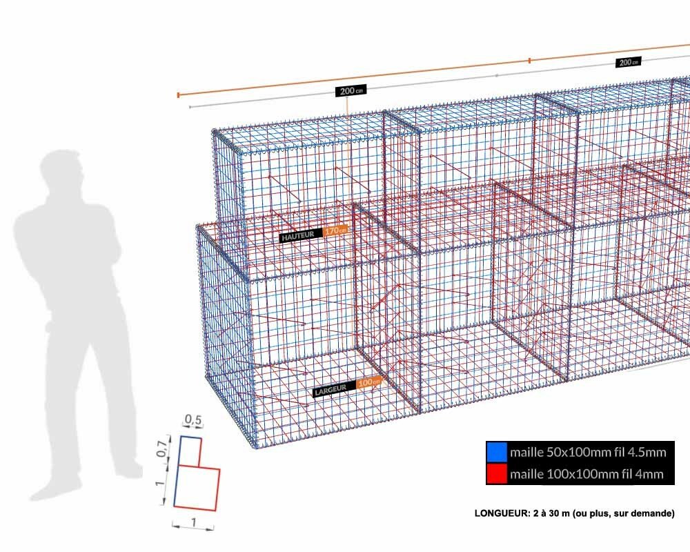 Ces gabions sont des modules de 2 ml, composés de panneaux de 2 m de long. Pour les kits de moins de 6 m de longueur, les côtés sont composés de panneaux de 1 m de longueur.
