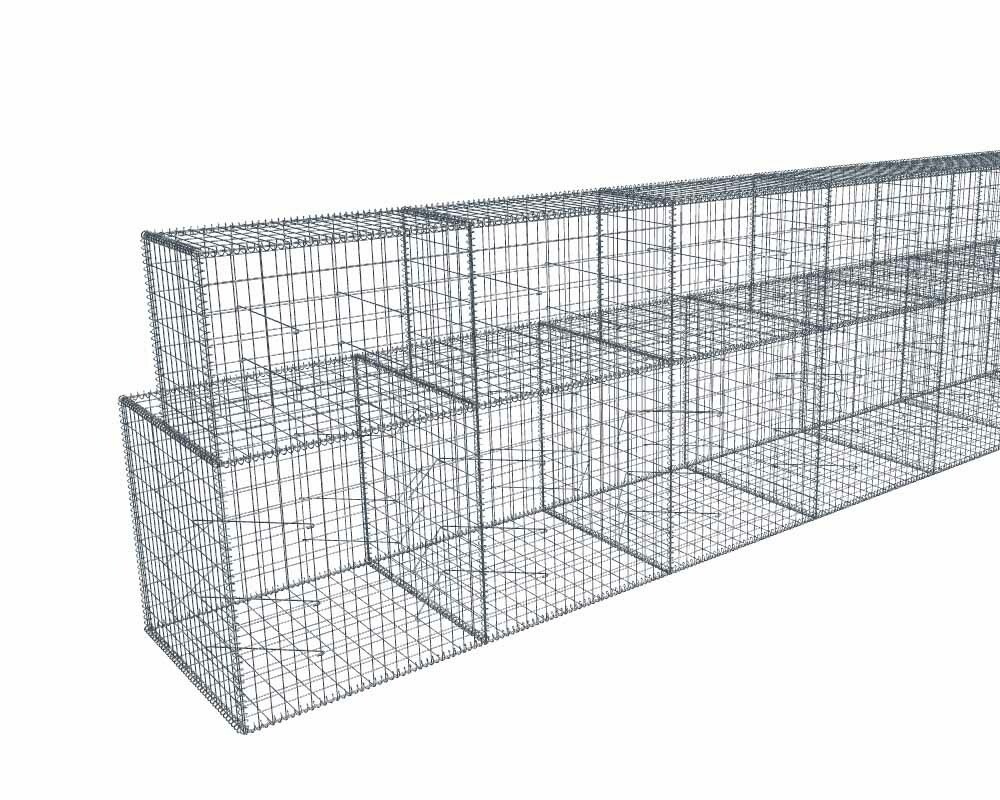 Il n'y a pas de doublement de cloisons. Seulement une cloison interne tous les mètres. Recoupe aisée avec une disqueuse ou une pince coupe-boulon. Ces gabions peuvent être superposés. Dans le cas de plusieurs rangs superposés, le couvercle du 1er rang servira de fond pour le 2eme rang, etc...